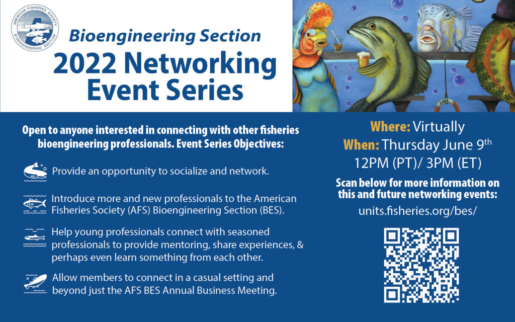 Save the date for the Bioengineering Section 2022 Networking Event Series! This event is open to anyone interested in connecting with other fisheries bioengineering professionals. It is being held virtually on Friday June 9th at 12pm (PT) / 3pm (ET). To register, click the following link, download the *.ics file, and add it to your calendar –> Sign Up / Calendar Invite Link