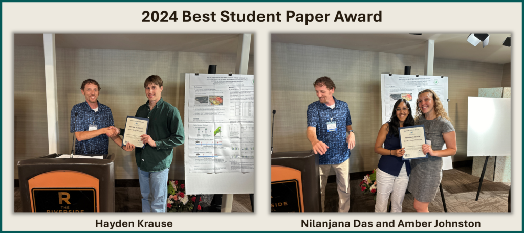 2024 – Hayden Krause (Oregon State University, MS), “Pathogen risk to juvenile spring-run chinook salmon (Oncorhynchus tshawytscha) in the Upper Klamath Basin, to inform reestablishment efforts”; Nilanjana Das (Oregon State University, PhD), “The emergence of Tetracapsuloides bryosalmonae in an Oregon salmonid hatchery”; Amber Johnston (University of Maine, PhD), “Exploring genetic resistance to Infectious Salmon Anemia Virus in captive North American Atlantic Salmon (Salmo salar)”