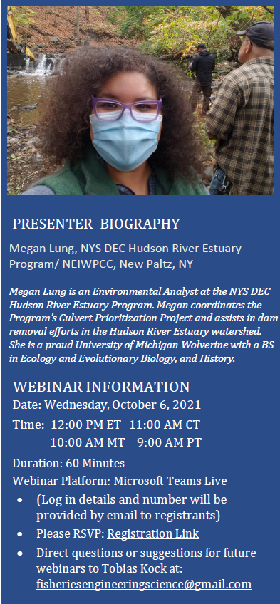 The Joint Committee on Fisheries Engineering and Science is hosting a free webinar series as part of its mission to engage scientists and engineers on topics related to fish passage. The Committee consists of members of the American Fisheries Society Bioengineering Section (AFS-BES) and the American Society of Civil Engineers Environmental and Water Resources Institute (ASCE-EWRI). It was established in January 2011 to foster communication between the two groups, provide opportunities for engineers and biologists to share relevant knowledge and learn from one another, and to collaborate on projects related to fish passage.