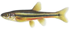 The Northern Redbelly Dace (Chrosomus eos, syn. Phoxinus eos) is a small-bodied minnow (family Leuciscidae, syn. Cyprinidae) native to the United States and Canada. Individuals have very small scales, an incomplete lateral line, 7–8 dorsal fin rays, and a moderately forked caudal fin (Brown 1971). Northern Redbelly Dace have a small, s-shaped mouth that does not reach below the front of the eye. Coloration is olive/brown on top with two dark stripes running laterally down its sides, from snout to tail. The lower sides and bellies are typically yellow or silver but, during spawning season, turn bright red on adult males. Brown (1971) reported that no individual larger than 2.3 inches had been reported in Montana; however, multiple surveys have since reported Northern Redbelly Dace approximately 4 inches long (FishMT 2020).