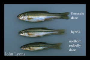 Few studies have documented the ecology of hybrid dace, but they probably display behavior and a life history intermediate between parental species. In fact, the niche of hybrid dace probably overlaps with both the mostly insectivorous Finescale Dace and the mostly herbivorous Northern Redbelly Dace, resulting in a more “general purpose” phenotype (Schlosser et al. 1998). Hybrid dace may have gained additional physiological flexibility through hybridization. For example, hybrid dace survive longer in oxygen stressed environments, consume a wider variety of food items, and exist in more varied physiochemical environments than either parental species (Schlosser et al. 1998; Mee and Rowe 2010). In certain environments hybrid dace seem to have a competitive advantage over Northern Redbelly Dace (Stasiak 1972; Stasiak 2006), whereas in others they do not appear to occur at all (Stasiak 1972; Felts 2013).