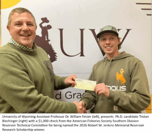 Tristan was unable to attend the 2026 SDAFS meeting in New Orleans, Louisiana. However, he presented his research remotely via Zoom during the Reservoir Technical Committee meeting. Tristan was presented the check from the Reservoir Technical Committee by his advisor Dr. Fetzer at the University of Wyoming. Congratulations Tristan!