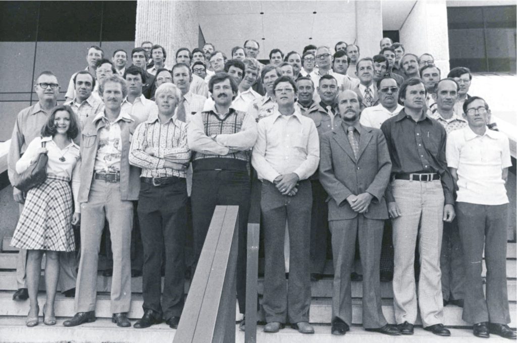 November 1975, the formation of the Texas Chapter of the American Fisheries Society on the Texas A & M College Station Campus.   First Row (L-R):  Shari Rische, Wade Butler, Allen Forshage, Charles Mulford, Ken Sellers, Ed Lyles, Steve Smith, and Roy Bamburg. Second Row: Dwane Smith, Paul Crandall, Bob Zerr, Nick Carter, Jimmy Dean, Buck Henderson, Leo Lewis, Lou Guerra, and Joe Toole. Third Row: Bill Rutledge, Charlie Menn, Ronnie Stapleton, Bill Brown (USFWS), Charles Leigon, Charlie Inman, and Mike Ryan.  Fourth Row: Paul Seidensticker, David Pritchard, Billy Follis, Barry Lyons, Roger McCabe, Dr. John Garcia, (Texas Tech. University), Dick Luebke, Gary Mooney, Alan Wenger, Rhandy Helton, and James Lasswell. Fifth Row:  Ernest Marsh, Joe Kraai, Bill Bailey, John Prentice, Clell Guest, Jeff Morris, Rick